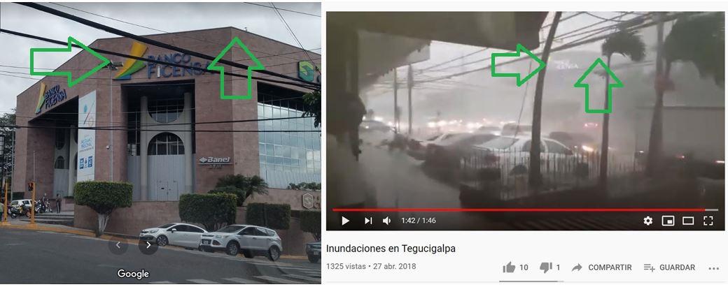 El video, subido a la plataforma el 28 de abril de 2018, se titula: “Inundaciones en Tegucigalpa”. Tiene mejor definición que la secuencia viralizada, por lo que al final se observan con mayor claridad dos palabras en los edificios: “BAC” y “Banco Censa”.