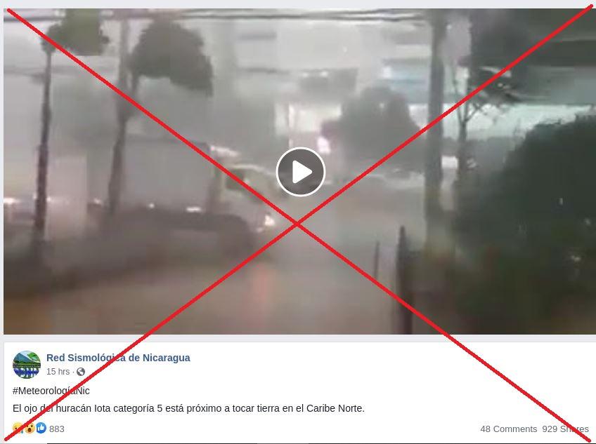 “El ojo del huracán Iota categoría 5 está próximo a tocar tierra en el Caribe Norte”, dice una publicación en Facebook (1, 2) junto al video. También circuló en Twitter (1) y en inglés (1).