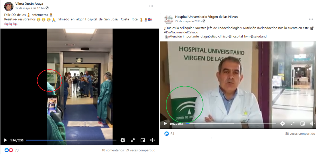 Asimismo, un artículo publicado el 5 de abril de 2020 en un medio de Granada muestra un video de la misma escena grabado desde otro ángulo. Estas imágenes habían sido publicadas originalmente el 3 de abril en la página de Facebook del departamento de Ginecología y Obstetricia del Hospital Universitario Virgen de las Nieves de Granada.