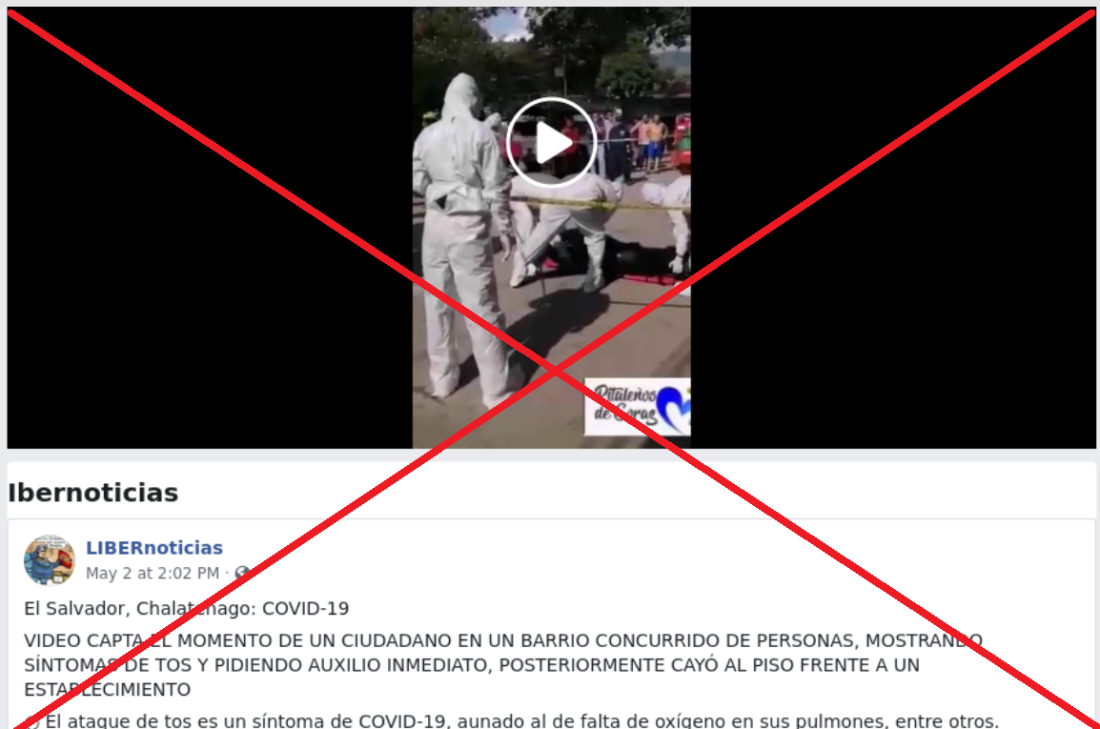 “El Salvador, Chalatenago: COVID-19. Video capta el momento de un ciudadano en un barrio concurrido de personas, mostrando síntomas de tos y pidiendo auxilio inmediato, posteriormente cayó al piso frente a un establecimiento (sic)”, indica una publicación en Facebook con el video que circula desde el 2 de mayo pasado.