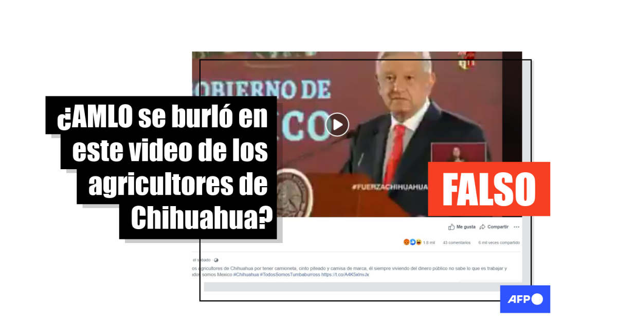 “Amlo burlandose de los agricultores de Chihuahua por tener camioneta, cinto piteado y camisa de marca, él siempre viviendo del dinero público no sabe lo que es trabajar y ganarse las cosas, Todos somos Mexico #Chihuahua #TodosSomosTumbaburross” [etiqueta de apoyo a una cuenta opositora del gobierno de López Obrador, NDLR], asegura una de las publicaciones que comparte el video en Facebook. La grabación también circuló en Twitter.