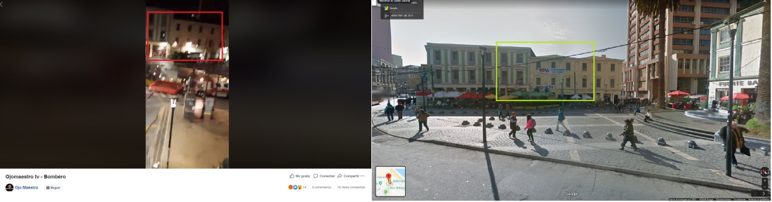 Según una de las cuentas de Facebook que compartió la secuencia, la escena tuvo lugar en la “Plaza Aníbal Pinto” de Valparaíso. Al comparar una captura de la secuencia viral con una tomada de Google Street View, AFP Factual pudo establecer que la escena sí fue grabada en esta plaza.