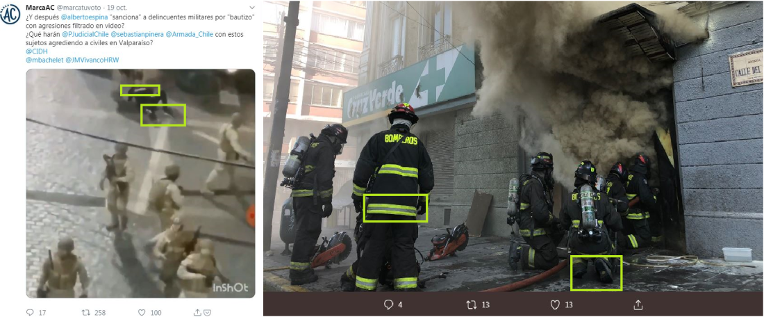 “Ahí tienen a sus milicos [militares] golpeando a un bombero, muy bonito”, reclama uno de los millares de usuarios de Facebook que ha compartido el video viral. La secuencia, que también ha sido reproducida por un portal, varias páginas de Facebook y al menos una cuenta de Twitter, muestra a varios militares arrastrando a una persona que viste ropa negra con franjas reflectoras, similares a las de los uniformes de los bomberos de Valparaíso.