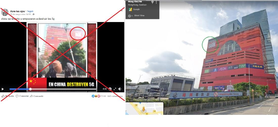 Circulan también entradas similares, con el mismo video, que aseguran que se trata del derribo de tecnología 5G en Hong Kong.