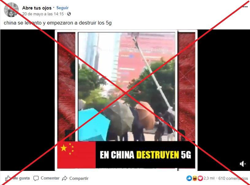 El video circula en Facebook (1 y 2) desde al menos el pasado 20 de mayo. “China se levantó y empieza a destruir los 5G”, asegura el texto que lo acompaña.
