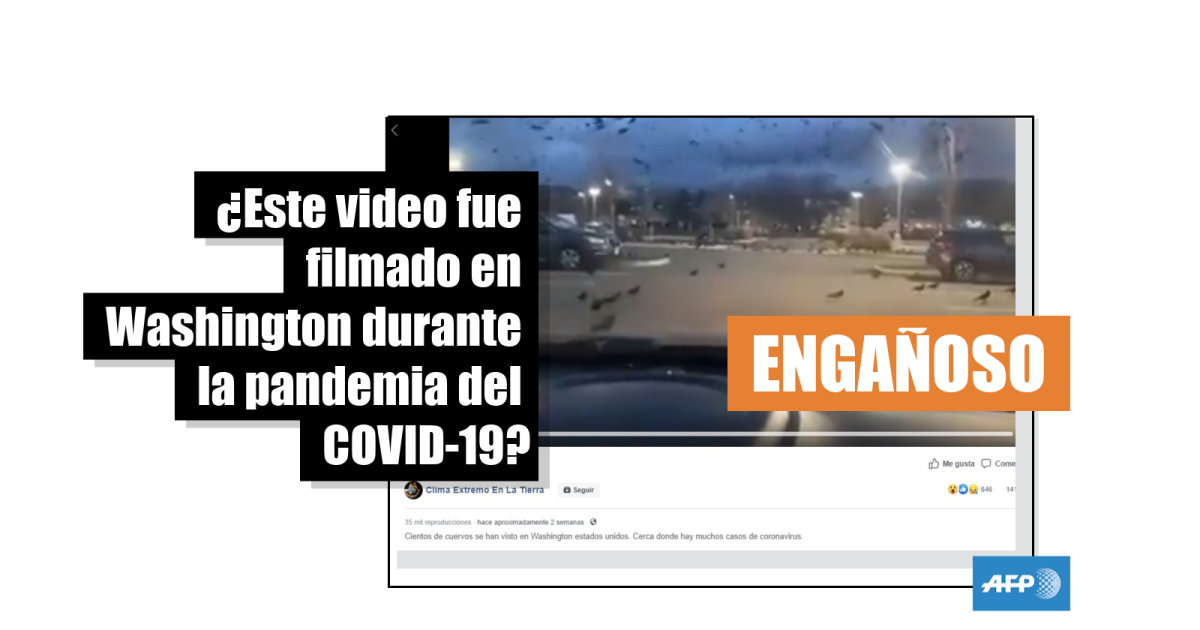 “Cientos de cuervos se han visto en Washington Estados Unidos. Cerca donde hay muchos casos de coronavirus. Esto también pasó en Wuhan China e Irán”, señalan publicaciones en Facebook (1, 2, 3) que circulan desde el 9 de abril de 2020 y muestran un video en el que se ve a una bandada de cuervos en un estacionamiento. Esta versión fue compartida más de 1.100 veces y tiene más de 42.000 reproducciones.