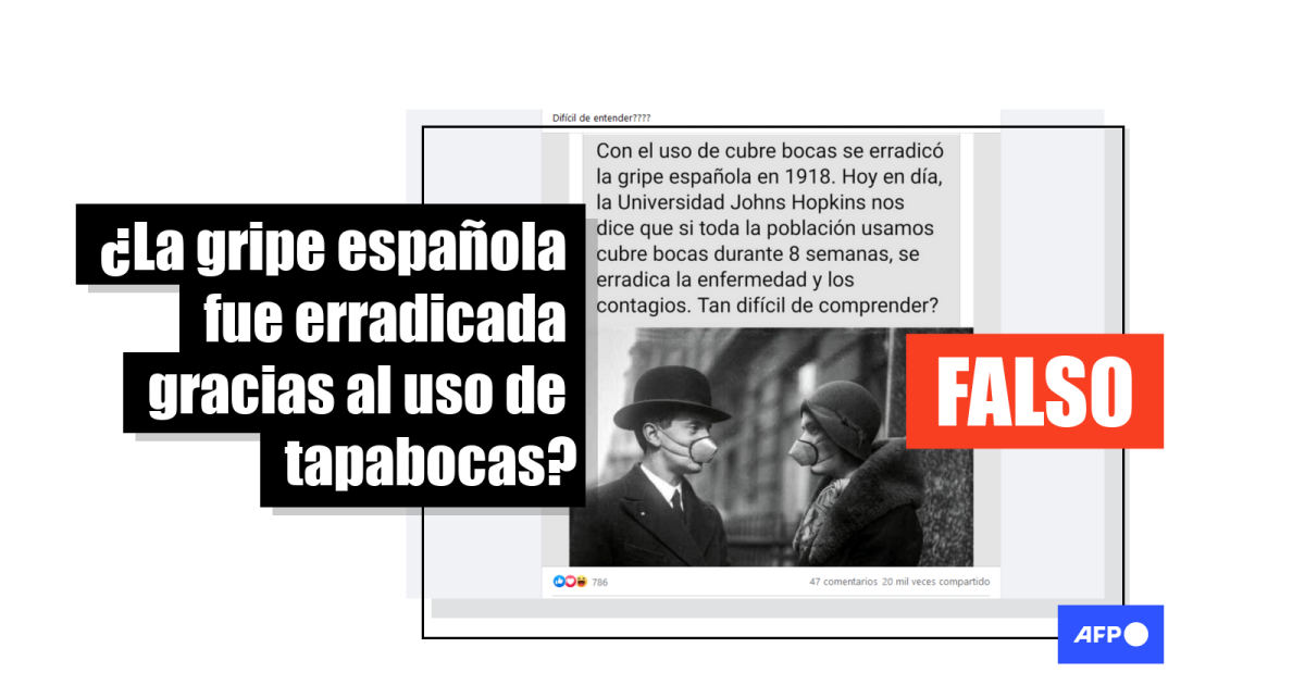 “Con el uso de cubrebocas se erradicó la gripe española de 1918”, se lee en una publicación en Facebook (1, 2, 3) que incluye la fotografía en blanco y negro de una pareja con mascarllas. “Hoy en día, la Universidad Johns Hopkins nos dice que si toda la población usamos cubrebocas durante 8 semanas, se erradica la enfermedad y los contagios. Tan difícil de comprender?”