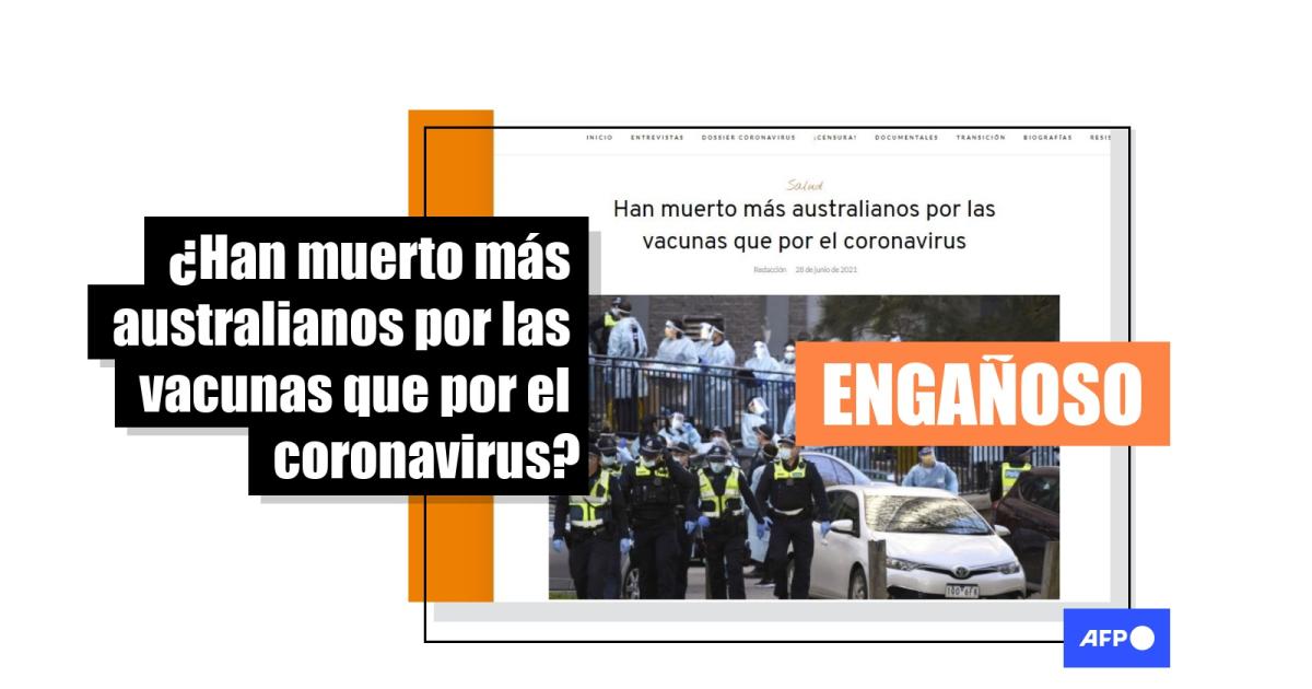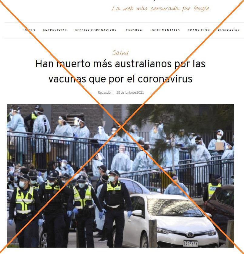 “En Australia tampoco ha habido ninguna pandemia”, señala esta página, citada en otra publicación, a su vez compartida en Telegram, donde fue vista por más de 54.000 usuarios. Los titulares de las dos webs son: “Han muerto más australianos por las vacunas que por el coronavirus” y “Mueren más australianos por las vacunas que por el coronavirus”.