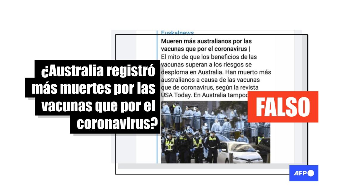“Mueren más australianos por las vacunas que por el coronavirus”, se lee en las publicaciones, que comparten una captura de pantalla de este sitio web. El artículo fue compartido más de 400 veces en redes sociales, pero, pese a lo que dice el titular, el texto explica después que la cifra de óbitos por la nueva enfermedad se refiere al año 2021, no a desde que comenzó la pandemia. Los usuarios, sin embargo, solo publicaron el titular. El artículo tampoco explica que las muertes mencionadas de personas vacunadas aún estaban en investigación.