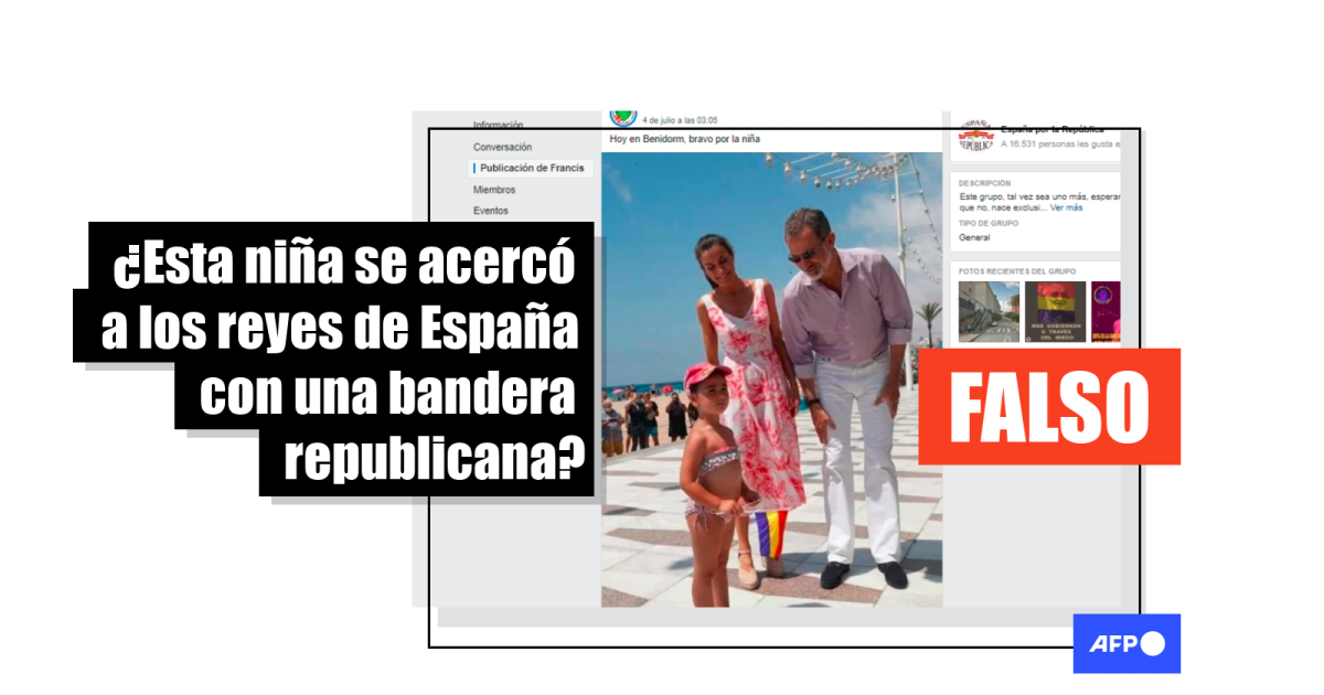 “Hoy en Benidorm, bravo por la niña”, dice una publicación en Facebook compartida alrededor de 400 veces desde el 4 de julio. La publicación adjunta una imagen de los reyes de España, Felipe VI y Letizia, en Benidorm (este), junto a una niña que lleva una bandera morada, roja y amarilla en la mano. La imagen también circula al menos a través de otra publicación compartida alrededor de 500 veces desde el 3 de julio.