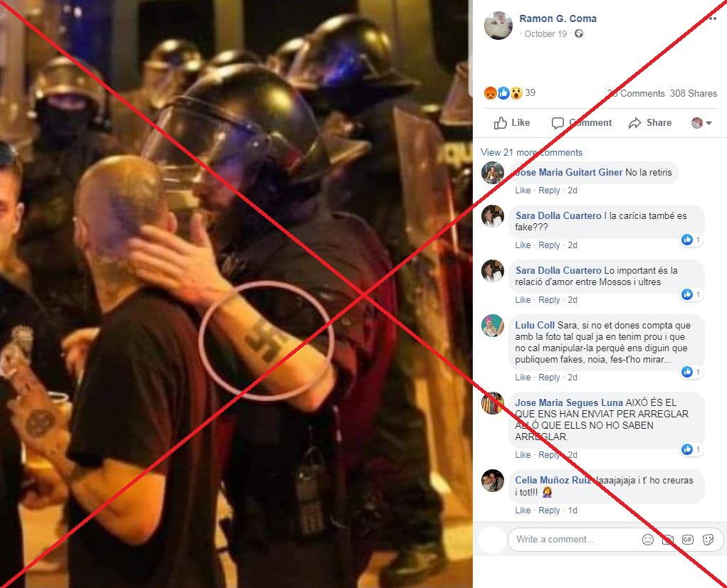 Por tanto, la fotografía viral en la que un agente de los Mossos d’Esquadra con una esvástica tatuada en el brazo habla con un manifestante está manipulada, ya que el policía no tenía tal tatuaje.