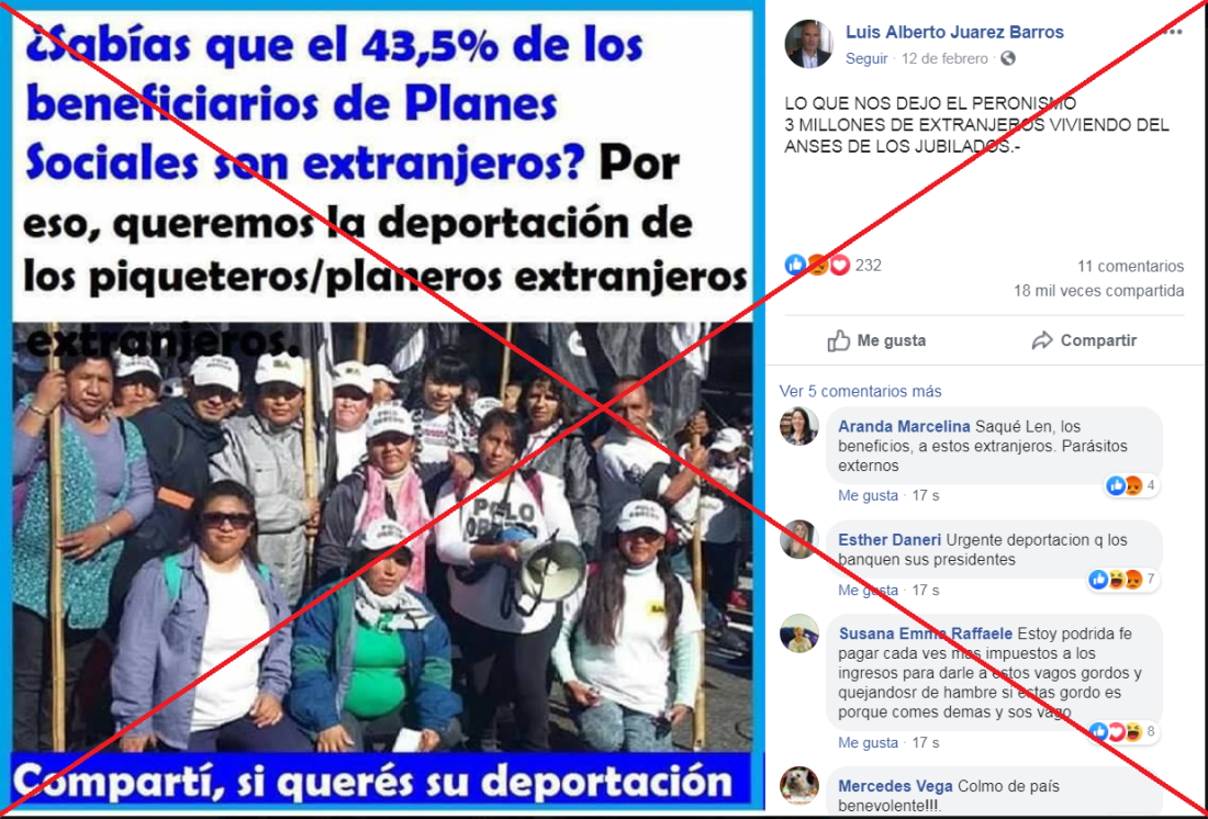 Las publicaciones que se volvieron virales denuncian que hay “3 millones de extranjeros viviendo del ANSES, de los jubilados”. Voceros del organismo aclararon también a Reverso que el término “plan social” no es el adecuado: “Nosotros administramos un sistema contributivo que tiene una parte de niñez, que son las asignaciones familiares, y otras son jubilaciones y pensiones, a partir de aportes y contribuciones de los contribuyentes”.