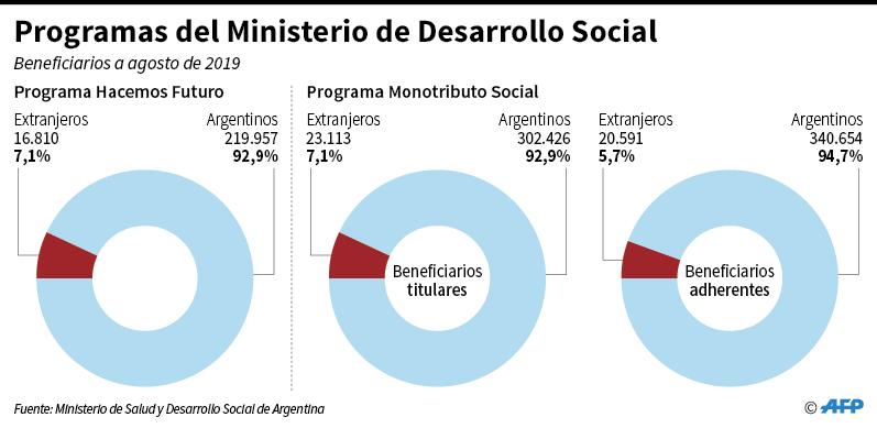 En el caso del Monotributo Social, los porcentajes son similares. De un total de 325.539 beneficiarios titulares del programa, solo un 7,1% es extranjero, mientras que de los 361.245 adherentes (parientes del titular que pueden beneficiarse también de la obra social a la que el monotributo da acceso), solo el 5,7% lo es. El presupuesto destinado al programa es de unos 2,9 millones de pesos (unos 50.877 dólares a la cotización actual).