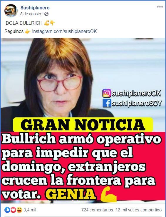 Durante las primarias en Argentina, circularon en Twitter, Facebook (1, 2 y 3) e Instagram publicaciones con una foto de Patricia Bullrich, ministra de Seguridad de la Nación, acompañada de la siguiente leyenda: “Bullrich armó operativo para impedir que el domingo extranjeros crucen la frontera para votar”.
