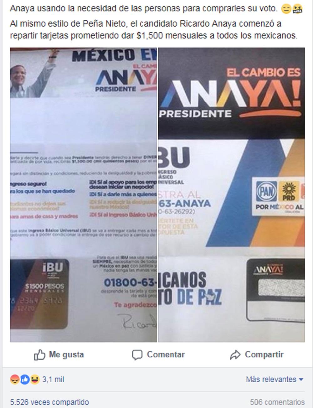Una publicación de Facebook se ha compartido más de 5.500 veces. Está integrada por un par de imágenes y un mensaje que dice “Al mismo estilo de Peña Nieto, el candidato Ricardo Anaya comenzó a repartir tarjetas prometiendo dar 1.500 pesos mensuales a todos los mexicanos”. Las fotografías muestran una tarjeta que aparenta a una bancaria y una hoja de propaganda.