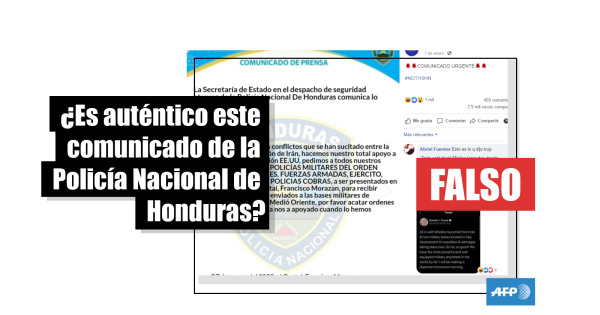“En relación con los últimos conflictos que se han suscitado entre la Nación de UU.EE y la Nación de Irán, hacemos nuestro total apoyo a nuestros aliados de la Nación de EE.UU (sic)”, dice la publicación que circula en Facebook que tiene el aspecto de un comunicado membretado por la Policía Nacional de Honduras.