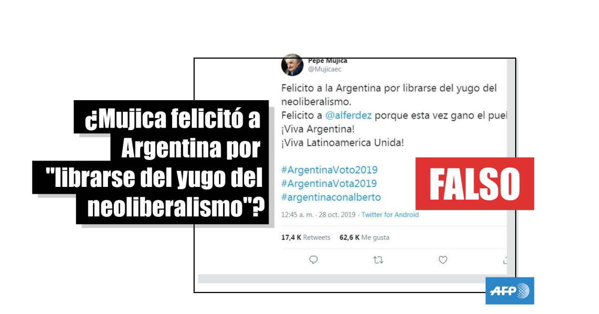 “Felicito a la Argentina por librarse del yugo del neoliberalismo. Felicito a @alferdez porque esta vez gano el pueblo. ¡Viva Argentina! ¡Viva Latinoamerica Unida! #ArgentinaVoto2019 #ArgentinaVota2019 #argentinaconalberto”, afirma la publicación desde la cuenta de Twitter @Mujicaec. El perfil lleva el nombre “Pepe Mujica” y tiene como foto una imagen del expresidente uruguayo (2010-2015). Además, varias capturas del tuit han sido publicadas más de 30 veces en Facebook.