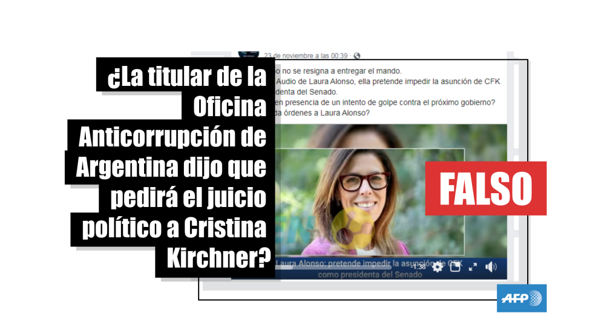 “Presunto audio de Laura Alonso con prédicas desestabilizantes, antes de asumir Alberto Fernández y @CFKArgentina: organiza denunciar a Cristina para desestabilizar al nuevo gobierno”, asegura una de las publicaciones en Facebook (1, 2), que fue compartida más de 2.300 veces junto al audio, de un minuto y medio, que también circuló en YouTube (1, 2).