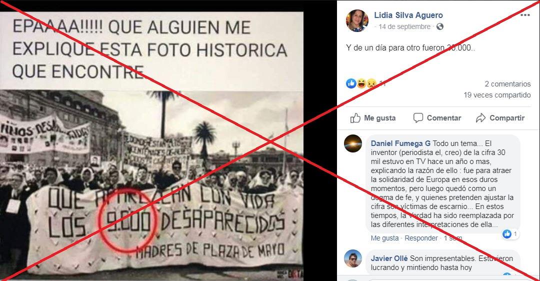 En conclusión, la foto de las Madres de Plaza de Mayo con una pancarta en la que supuestamente piden por los “9.000” desaparecidos durante la última dictadura militar argentina es un montaje. En la foto original, que fue tomada en 1982, la cifra es “30.000”.
