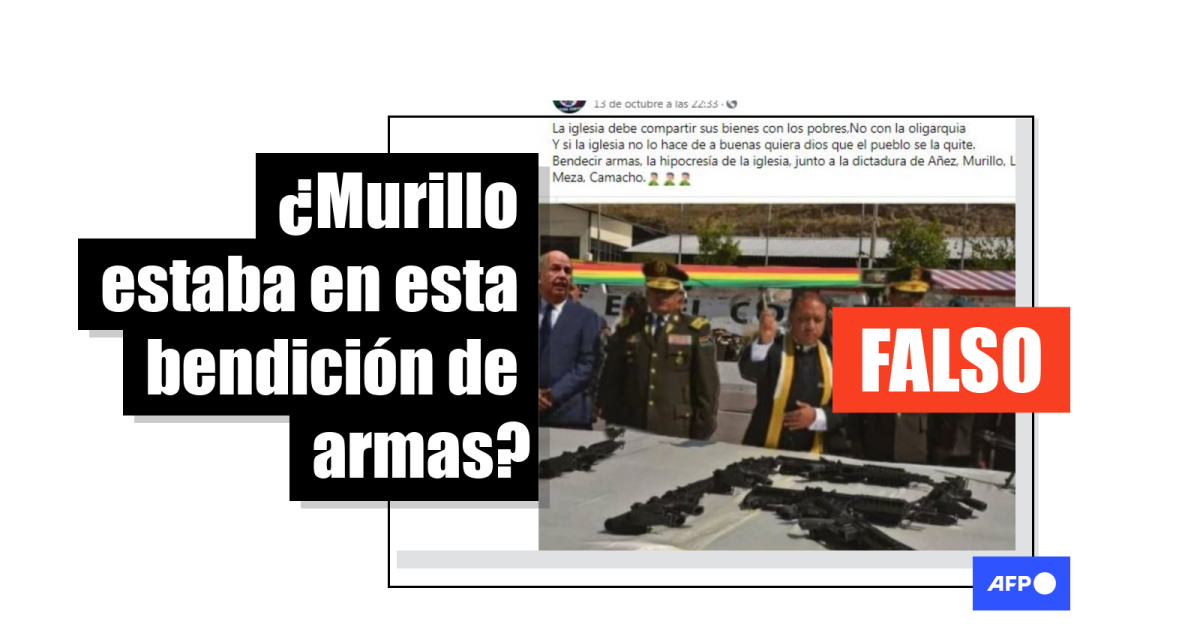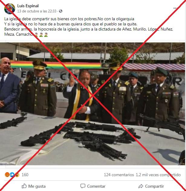 Junto al texto se muestra una foto en la que se observa a un sacerdote católico junto a un grupo de militares o policías, arrojando agua bendita hacia una mesa en la que se ubican varios fusiles. A la izquierda de la foto, un hombre de traje y corbata con el rostro del saliente ministro Arturo Murillo. Al fondo se observa una bandera con los colores de Bolivia.