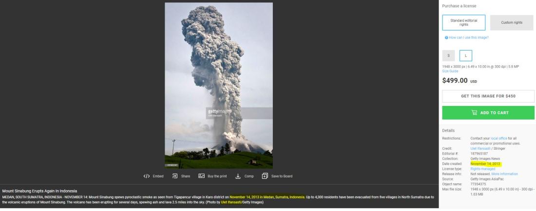 Una búsqueda inversa nos confirma al fotoperiodista indonesio como autor de la imagen del monte Sinabung, durante una erupción el 14 de noviembre de 2013. La fotografía fue tomada desde la villa Tiga Pancur (al norte de la isla de Sumatra), a unos 20 km del coloso.