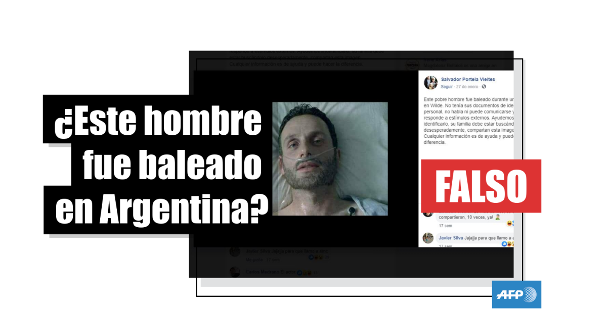"Este pobre hombre fue baleado durante un tiroteo en Wilde [provincia de Buenos Aires]. No tenía sus documentos de identificación personal, no habla ni puede comunicarse y no responde a estímulos externos. Ayudemos a identificarlo, su familia debe estar buscándolo desesperadamente, compartan esta imagen", señala el texto de la publicación.