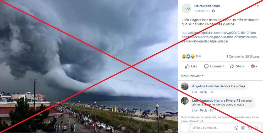 Una búsqueda inversa en Google demostró que no es una foto del tifón en Japón, ya que fue publicada en un artículo del diario estadounidense Washington Post el 26 de agosto de 2019. El titular del artículo dice: “‘Espectacular’ y ‘locura’: Increíble formación de nubes sobre una popular playa de Delaware”. La leyenda de la foto sigue: “Una nube amenazadora se acerca a la playa Rehoboth, Del., el 19 de agosto”, y está firmada por Don Burdick, quien fue entrevistado por el diario.