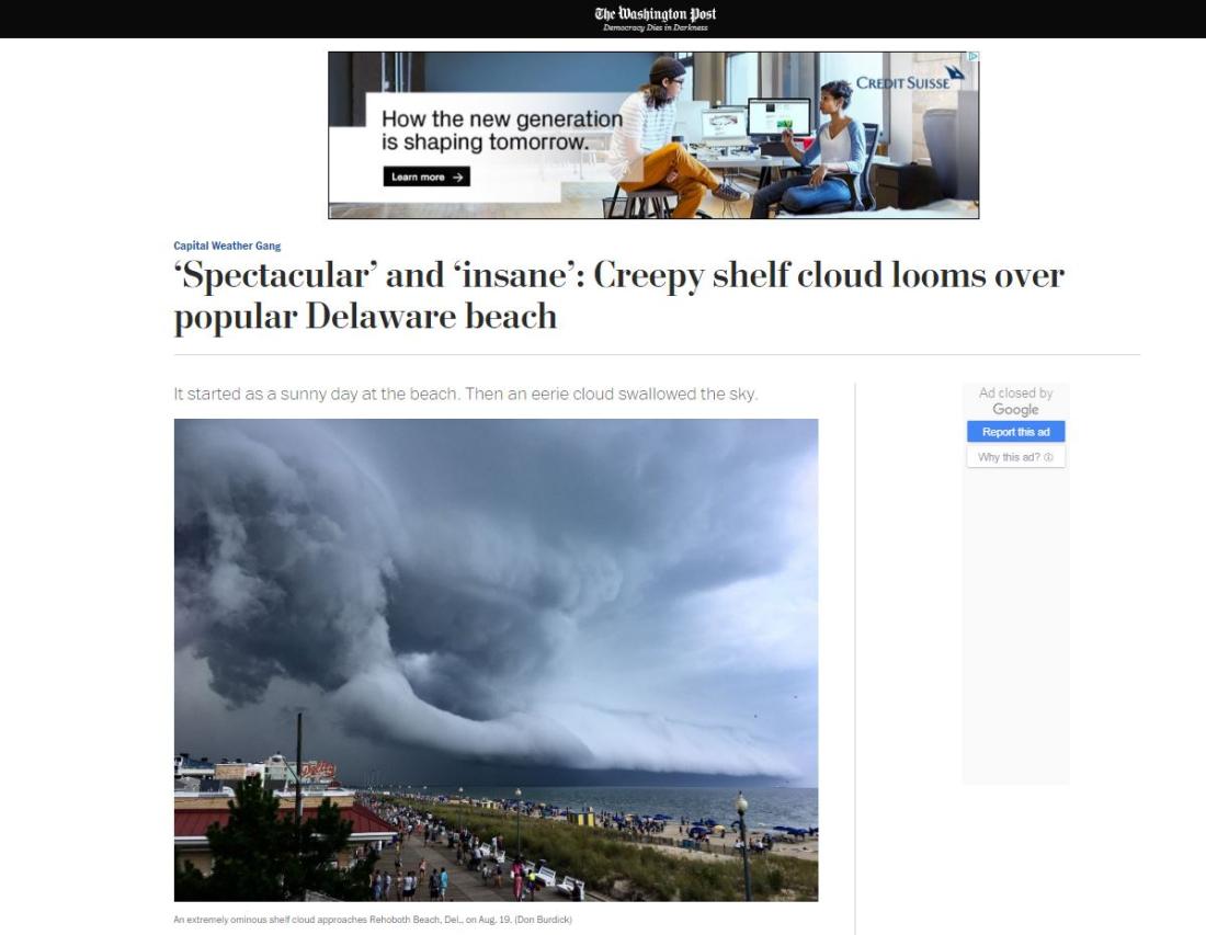 En uno de los párrafos del artículo, se lee: “La mayoría de la gente va a la playa Rehoboth, Del. (Delaware, NDLR), en verano para un ambiente y cielos tranquilos. La foto de Don Burdick desde la playa Rehoboth parece de otro planeta (...) La foto, tomada el pasado lunes, es inquietante. Muestra una nube del tipo ‘cumulonimbus arcus’ que anuncia una tormenta inminente - con vientos de 75 millas por hora en el mar. Granizo del tamaño de medio dólar cayó al norte de la bahía de Indian River”.