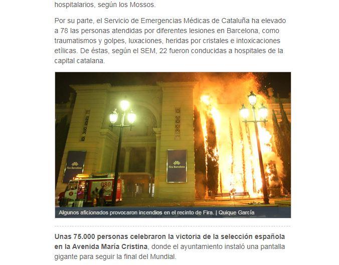 Según el propio artículo de El Mundo, citando a los Mossos d’Esquadra, “se produjeron incidentes como la quema de árboles” en Barcelona. En total hubo 21 detenidos y 74 heridos en aquellas celebraciones, la noche del 11 de julio de 2010.
