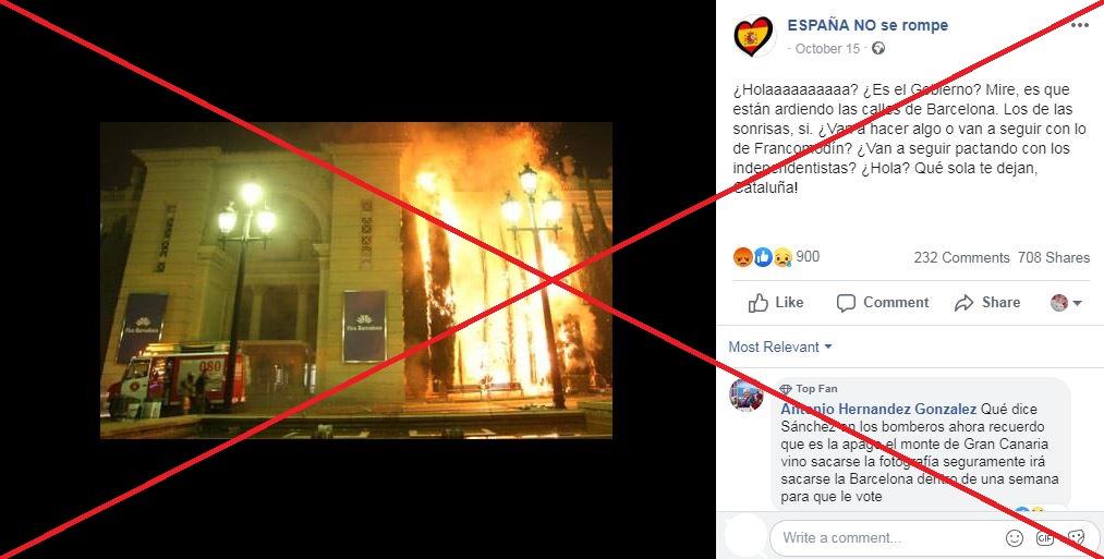 “Están ardiendo las calles de Barcelona”, dice una publicación en Facebook, que pregunta al Gobierno español: “¿Van a seguir pactando con los independentistas? ¿Hola? Qué sola te dejan, Cataluña”. La leyenda se refiere a los disturbios que por cuarta jornada tenían lugar en distintos puntos de la región a raíz de la sentencia judicial contra líderes independentistas catalanes.