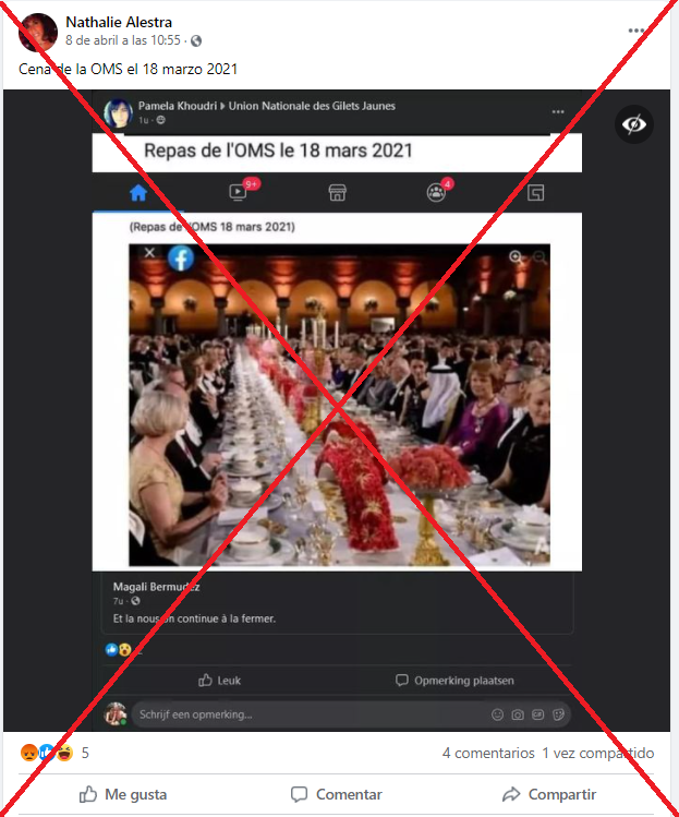 “¡Realmente somos los idiotas de esta historia!”, reza en francés la imagen de la supuesta cena de la OMS a mediados de marzo que se ha compartido en español en Facebook (1, 2, 3) y en Twitter. El meme también circula en francés.