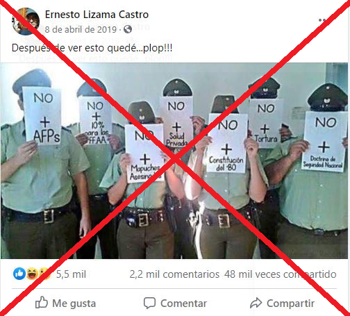 Esta fotografía de policías chilenos con consignas de "no + AFP" y "no + tortura" es un montaje