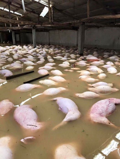 Una imagen muestra los cuerpos de cientos de cerdos muertos flotando en aguas turbias que inundan un edificio. Esta foto es la que fue tomada más lejos de Carolina del Norte (este de Estados Unidos), en la provincia de Thanh Hoa en Vietnam, en el distrito rural Yen Dinh, luego de una depresión tropical que afectó la zona el año pasado. La imagen fue publicada en redes sociales por primera vez el 12 octubre de 2017 en un grupo de Facebook de habitantes de esa provincia.