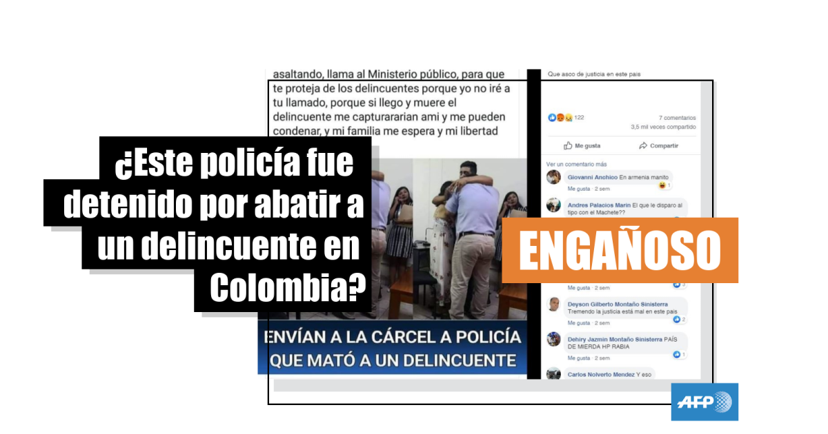 “Qué asco de justicia en este país”, opina el usuario colombiano que divulgó el meme -una imagen con un texto- en Facebook el 13 de mayo de 2019. De acuerdo con el mensaje que lo acompaña, muestra el momento en que “envían a la cárcel a policía que mató a un delincuente”.