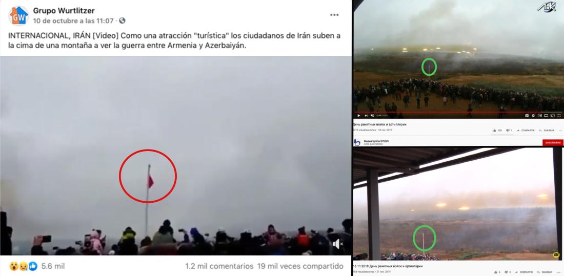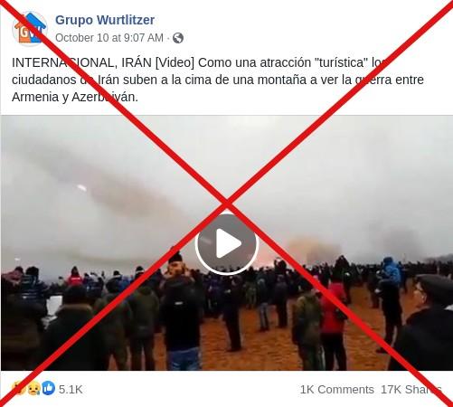 “Como una atracción ‘turística’ los ciudadanos de Irán suben a la cima de una montaña a ver la guerra entre Armenia y Azerbaiyán”, dicen publicaciones en Facebook (1, 2) junto con el video. La misma secuencia con mensajes similares ha circulado en esa misma red social (1, 2), en Twitter (1) e Instagram (1, 2).
