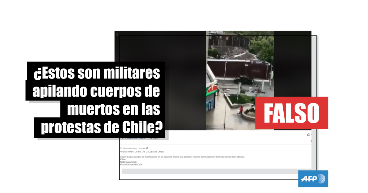 “Militares apilan cuerpos. Pinochet aún gobierna en el país austral”, señala una de las publicaciones en Twitter con un fragmento de video, que superó los 2.900 retuits. En Facebook (1, 2, 3, 4, 5, 6), el video ha sido compartido más de 1.500 veces y acumula más de 30.000 reproducciones en distintas publicaciones que también aseguran que los militares “apilan muertos” o que “cuerpos presuntamente fallecidos” son reunidos en una pila “resguardada por militares en la calle”.