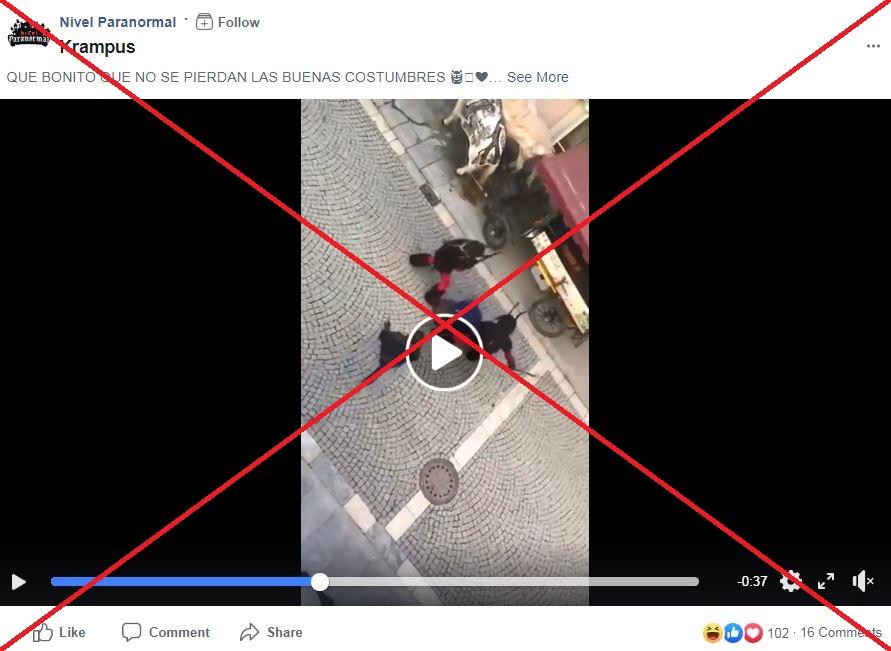 En las imágenes, un grupo de personas corre por una calle huyendo de hombres disfrazados de diablos. Varios de ellos, alcanzados por los “diablos” (llamados “krampus”) reciben golpes con varas y patadas. “El evento anual de Krampus en el South Tyrol se vuelve brutal después de que algunos espectadores intentan quitar las máscaras de los personajes de Krampus, según algunos informes italianos [sic]”, dice la publicación en español. Continúa luego con un texto entre comillas, aunque sin citar la fuente: “Parece que algunos inmigrantes en el camino provocaron al Krampus tratando de quitarles la máscara a algunos de ellos. Los demonios enmascarados se apresuraron con una agresividad inusual en la multitud, golpeando al azar con patadas y golpes”.