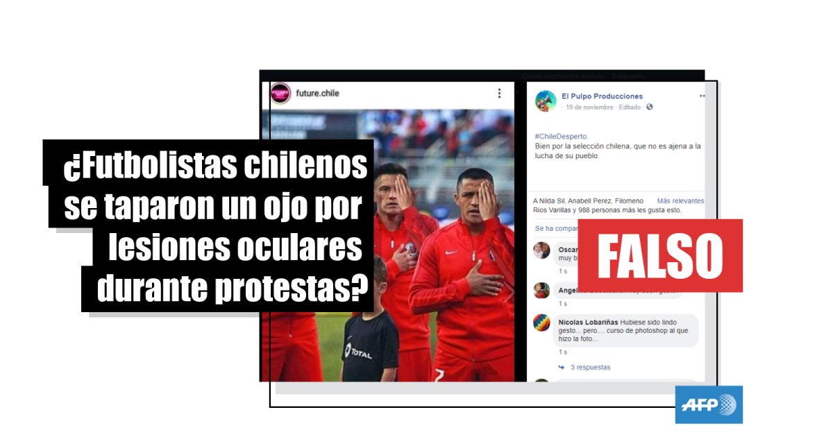 En la publicación original, la imagen tiene la siguiente leyenda: “Este fue el gesto que hicieron los jugadores de la roja durante el himno nacional, como protesta ante la impunidad de quienes hirieron a más de 250 chilenos en sus ojos y no recibieron condena”.