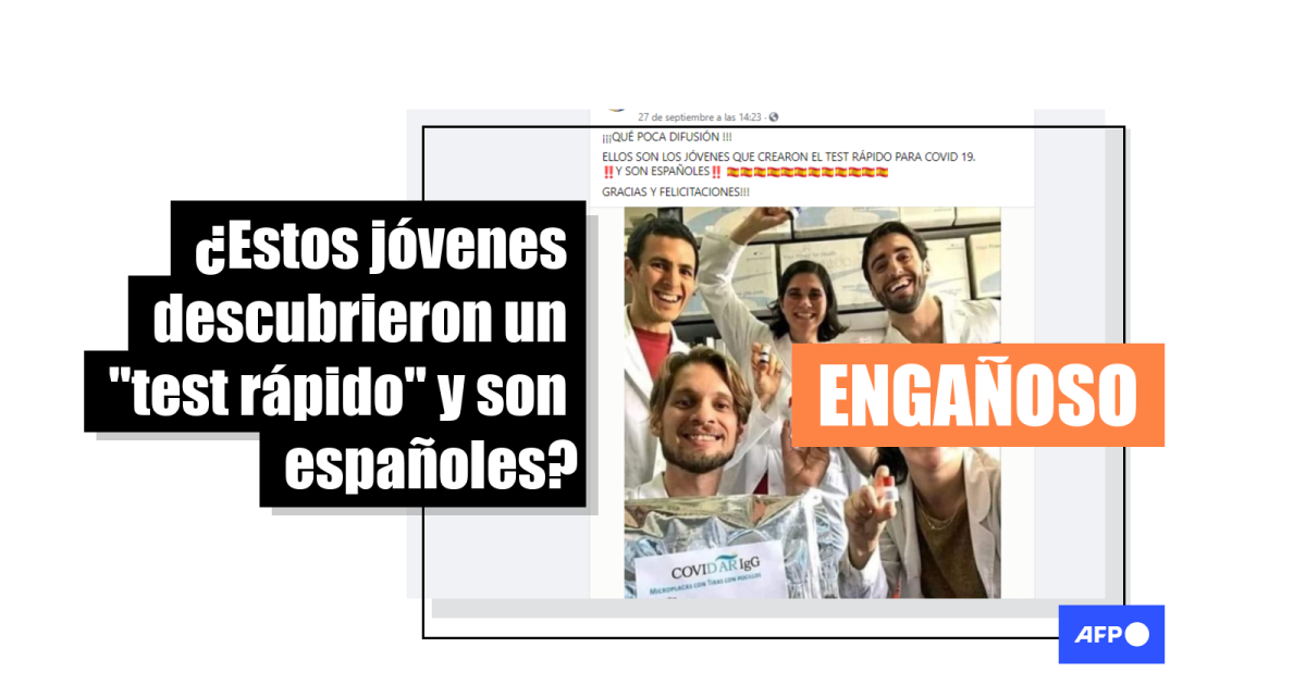 “¡¡¡QUÉ POCA DIFUSIÓN !!! ELLOS SON LOS JÓVENES QUE CREARON EL TEST RÁPIDO PARA COVID 19. ‼️Y SON ESPAÑOLES‼️ GRACIAS Y FELICITACIONES!!!”, dice la leyenda de la publicación. Esta adjunta la imagen de cinco jóvenes sonrientes con batas blancas. Uno de ellos sostiene un cartel en el que se puede leer: “COVIDAR IgG Microplacas con Tiras con Polículos. Conservar entre 2 y 8 ºC. IvD. Laboratorio Lemos S.R.L - INDUSTRIA ARGENTINA.”