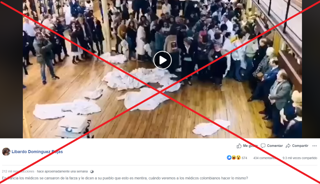 “En francia los médicos se cansaron de la farza y le dicen a su pueblo que esto es mentira, cuándo veremos a los médicos colombianos hacer lo mismo? [sic]”, señala una publicación con un video, compartida más de 9.300 veces desde el pasado 8 de julio en Facebook (1, 2, 3).