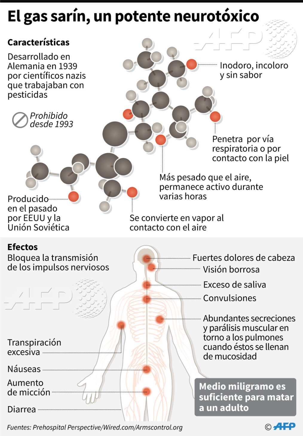 El gas sarín es un arma química que se expande rápidamente en el aire y en minutos genera mareos, vómitos, acelera el pulso y crea dificultades para respirar en las personas que se han expuesto a él, teniendo bajas posibilidades de sobrevivir, de acuerdo con los Centros para el Control y la Prevención de Enfermedades de Estados Unidos.