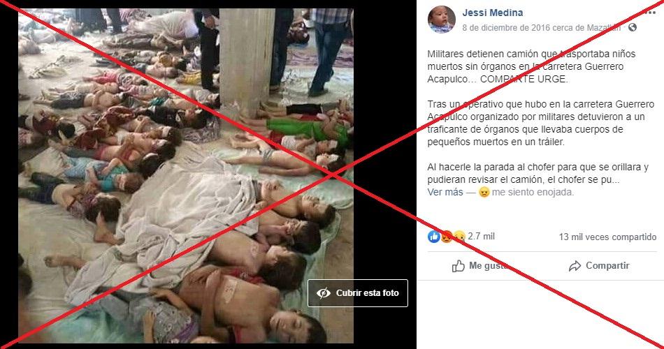 “Militares detienen camión que trasportaba niños muertos sin órganos en la carretera Guerrero Acapulco… COMPARTE URGE (sic)”, así comienza el mensaje en una publicación de Facebook de diciembre de 2017, que incluye la fotografía con los cadáveres de los menores.