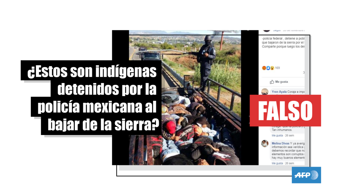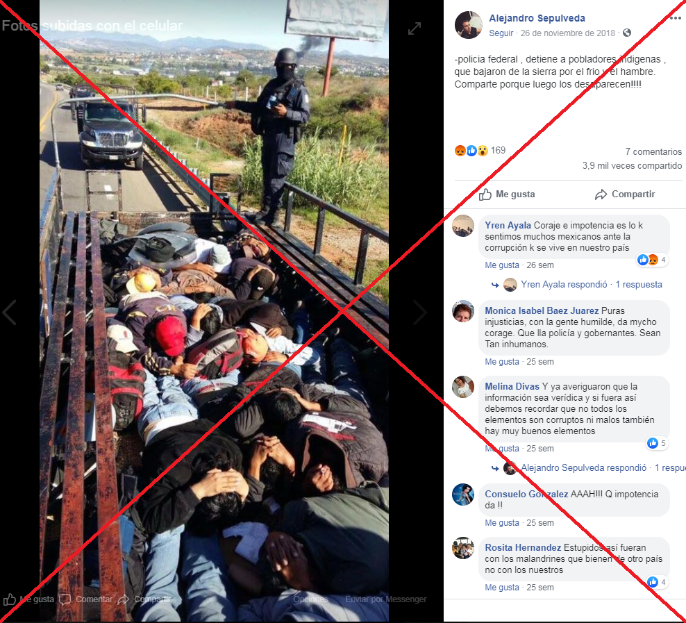 “Policía federal , detiene a pobladores indígenas , que bajaron de la sierra por el frío y el hambre. Comparte porque luego los desaparecen”, asegura la publicación en Facebook que ha sido compartida casi 4.000 veces.