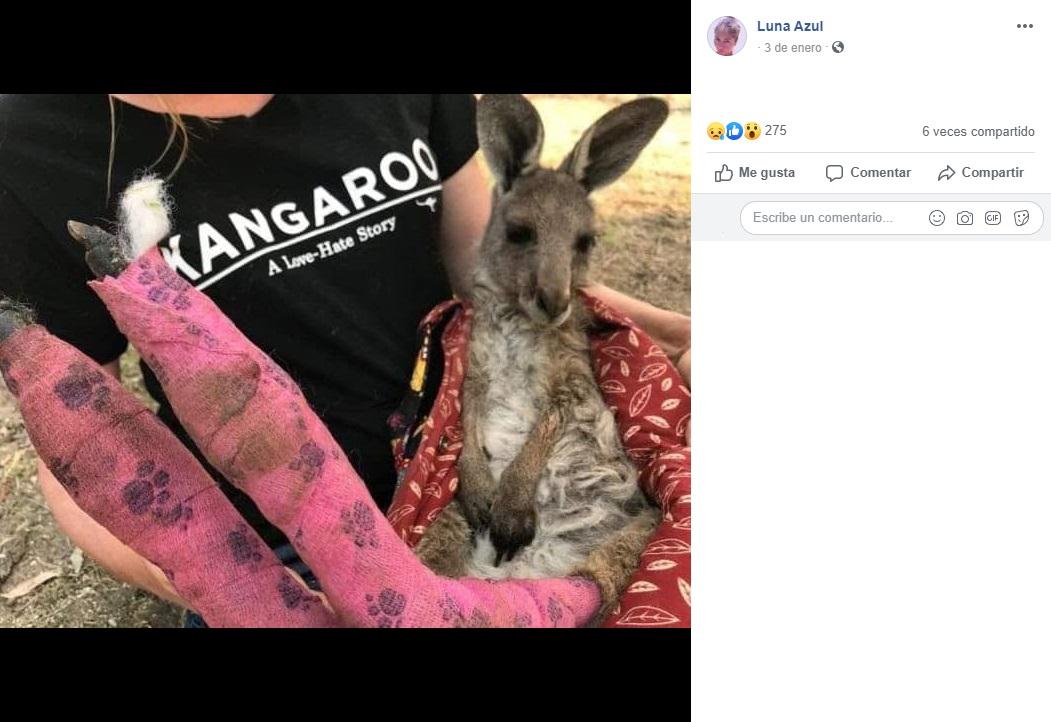 La imagen muestra a un bebé canguro con aparentes signos de haber pasado cerca de una zona incendiada, con vendas de color rosa en las patas. El animal es sostenido por una mujer que viste una camiseta con la leyenda, en inglés: “Canguro, una historia de amor-odio”.