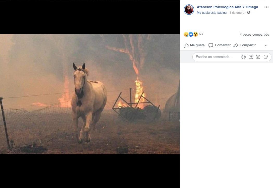 En redes sociales circula también la imagen de un caballo de color blanco huyendo del fuego. Fue tomada el 31 de diciembre de 2019 por el fotógrafo de AFP Saeed Khan.