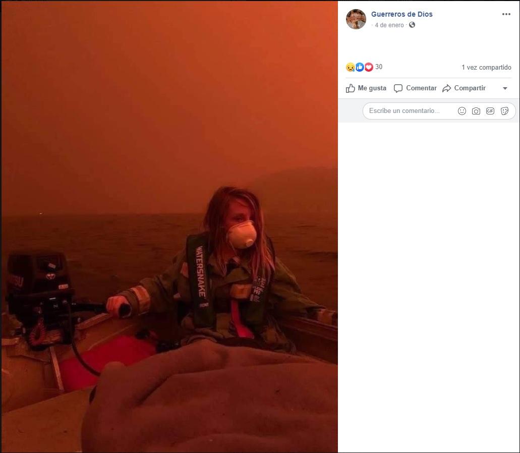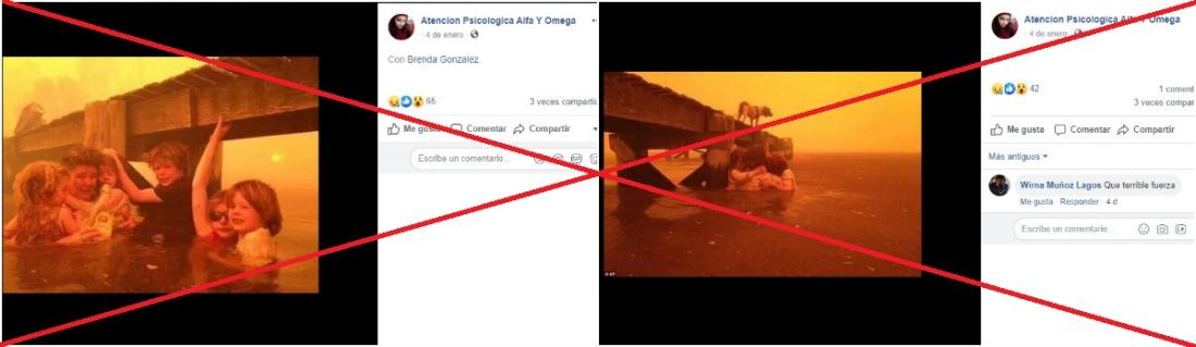 En dos de las fotos que aparecen en los álbumes se ve a una mujer junto a cinco niños sumergidos en el agua, aferrándose a la estructura de un muelle, aparentemente protegiéndose de los incendio. La imagen es real, pero no corresponde a los incendios actuales.