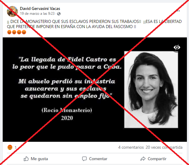 Varias entradas en Facebook (1, 2, 3) y en Twitter, también en catalán, reproducen esta supuesta cita de Rocío Monasterio, diputada de Vox en la Asamblea de Madrid y candidata para las próximas elecciones regionales.