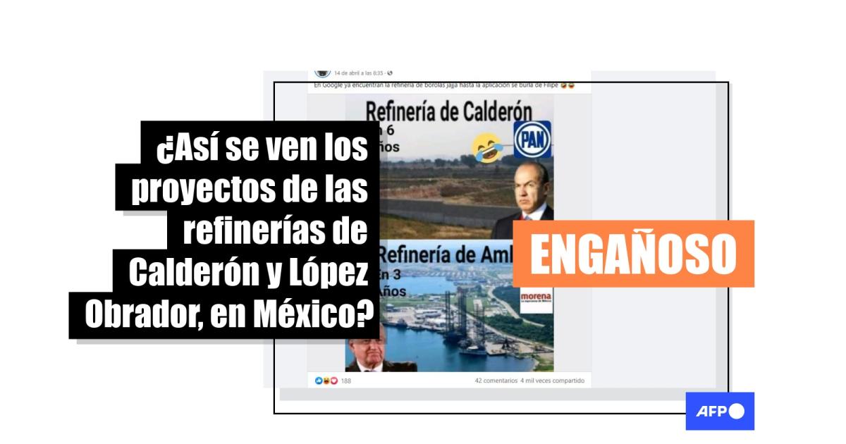 La imagen supuestamente compara fotografías de proyectos energéticos de Calderón (2006-2012) y López Obrador. En el caso del primero, muestra un terreno vacío y una barda, con la leyenda “Refinería de Calderón En 6 años”.
