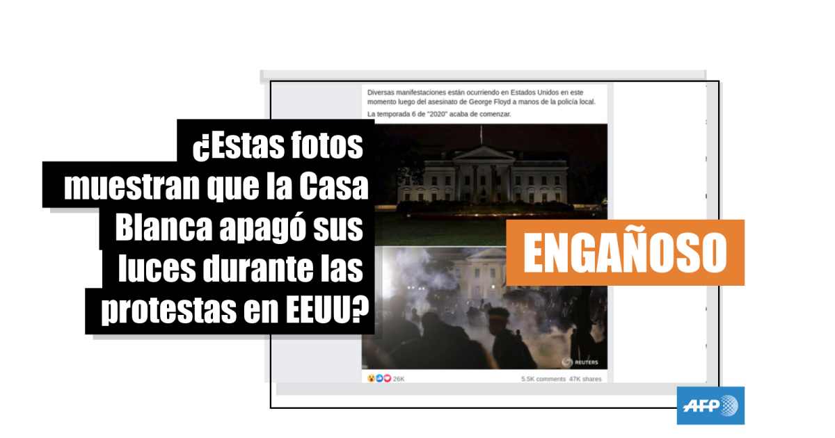 Dos tipos de publicaciones virales afirman que durante las protestas en Washington D.C. por la muerte del ciudadano negro George Floyd en manos de un policía blanco el 25 de mayo pasado en Minneapolis (Minnesota), la Casa Blanca apagó sus luces “por primera vez en la historia” mientras el presidente, Donald Trump, era llevado a un búnker.