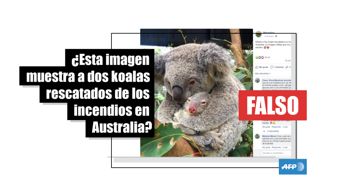 “Madre e hijo koala rescatados en incendio de Australia. La imagen refleja que los animales sienten”, señala una publicación en Facebook del pasado 3 de enero, acompañada por la foto de un marsupial adulto abrazando a su cría.